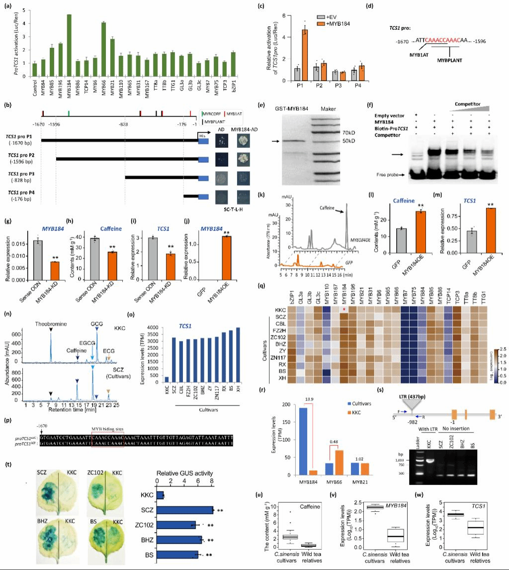咖啡碱生物合成途径的核心部分为黄嘌呤核苷(xanthosine)经3步甲基化和1步核苷水解作用最终生成咖啡碱。在茶树基因组中,至少有11个N-methyltransferase(NMT)基因参与这三步甲基化过程。其中茶咖啡碱合成酶1(TCS1)在幼嫩叶片中高表达来催化最后一步由可可碱的1-N位甲基化反应而合成咖啡碱。 TCS1是咖啡碱合成的限速酶基因。本研究通过WGCNA、TCS1启动子激活筛选等,在茶树基因组中筛选到一个调控咖啡碱合成的R2R3 MYB类转录因子MYB184。MYB184能直接结合并激活TCS1启动子。茶树体内实验进一步证明该基因能直接调控TCS1基因表达以及咖啡碱合成。现代栽培茶树(包括大叶种和小叶种)中TCS1表达和咖啡碱积累虽然有差异,但多数不特别大,而且可可碱含量一般很低。