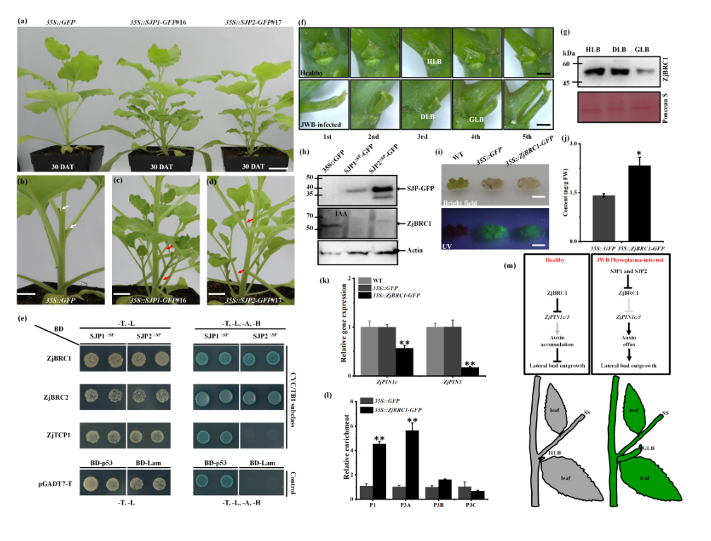 作者从枣疯病病株中分离鉴定到两个16SrV-B家族植原体效应因子SJP1和SJP2,其转基因烟草均表现出矮化、侧枝丛生症状。体内互作、共定位和共表达分析结果表明效应因子SJP1和SJP2从细胞质异位至细胞核与CYC/TB1-TCP 转录因子ZjBRC1互作,并介导其降解;SJP1和SJP2的N端和C端α-螺旋影响该进程。此外,植原体侵染抑制枣头侧芽ZjBRC1积累、激活ZjPIN1c/3表达、降低生长素含量,继而打破侧芽休眠。进一步研究表明,转录因子ZjBRC1直接结合生长素转运因子ZjPIN1c和ZjPIN3启动子,并下调其表达活性,从而促进ZjBRC1转基因枣愈伤中生长素积累。这些结果为解析植原体诱发枣疯病的分子机制及生产上枣疯病的综合防控提供理论依据。