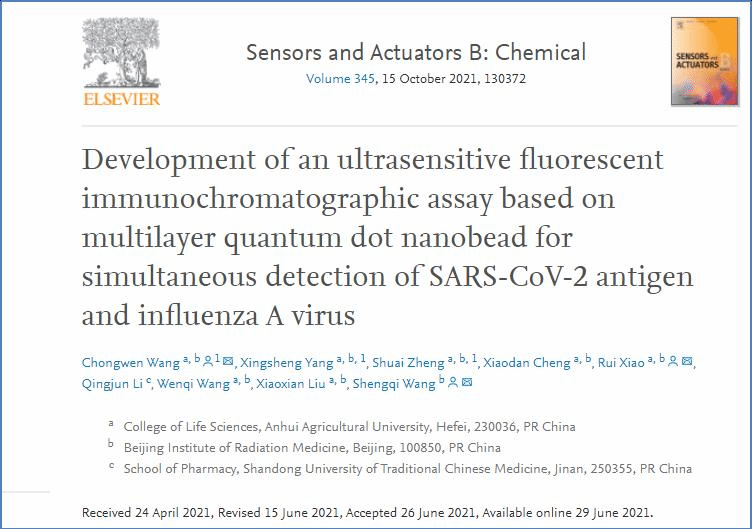 新研制的多层量子点免疫层析技术检测呼吸道病毒的灵敏度比现有胶体金试纸条和ELISA试剂盒分别提高100倍和20倍,检测时间小于15分钟,可同时定量分析多个目标病毒。相关内容发表在中科院一区杂志《Sensors and Actuators B: Chemical》(TOP期刊,影响因子7.4)上,汪崇文副教授为本文的第一作者兼通讯作者,本校为第一单位。全文链接: