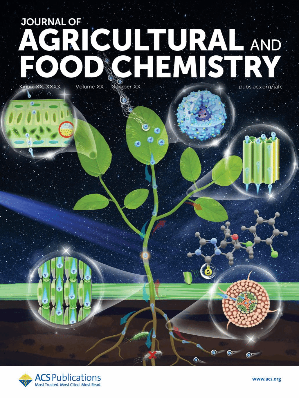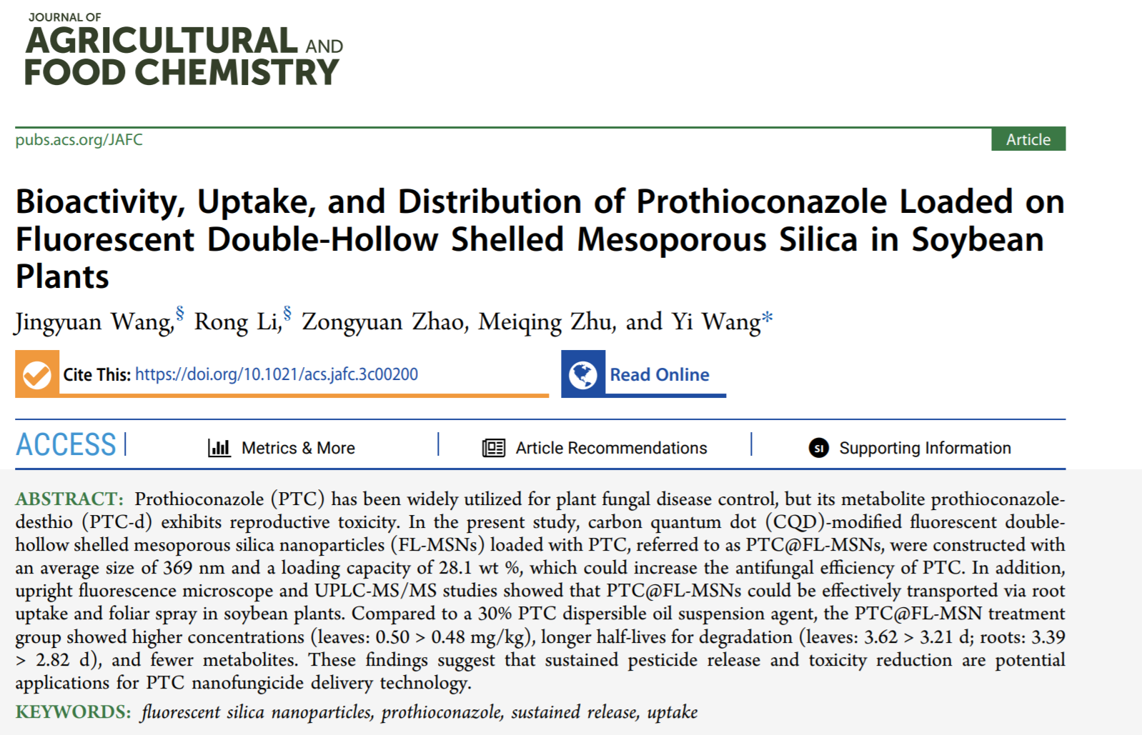 本网讯 近日,我校资源与环境学院王毅教授在农林科学领域一区Top期刊《Journal of Agricultural and Food Chemistry》(IF:5.895)发表了题为“Bioactivity, Uptake, and Distribution of Prothioconazole Loaded on Fluorescent Double-Hollow Shelled Mesoporous Silica in Soybean Plants”的封面文章,在纳米农药应用方面取得新进展。该研究提出了一种荧光介孔二氧化硅杀菌剂,不仅具备良好的抑菌活性,同时实现了农药在植物体内的可视化,并且减少高毒代谢物的产生,降低了农药使用风险。