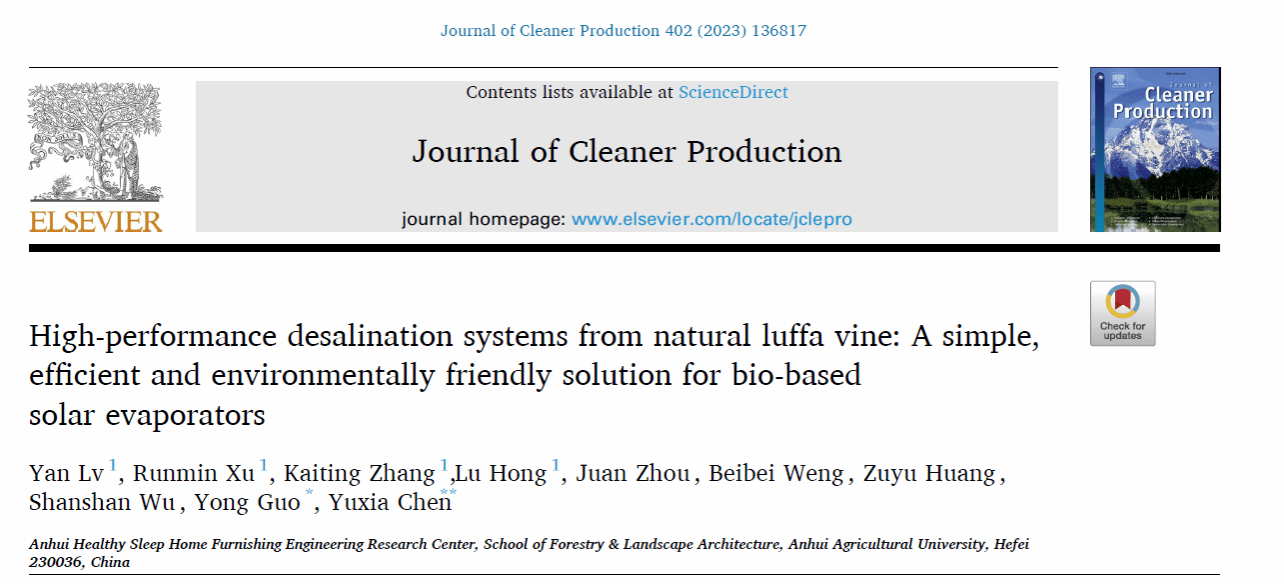 本网讯 近日,我校林学与园林学院陈玉霞教授和郭勇教授在中科院一区top期刊《清洁生产》(《Journal of Cleaner Production》)发表了题为《源于天然丝瓜藤的高性能海水淡化系统:一种简单、高效、环保的生物基太阳能蒸发器解决方案》(High-performance desalination systems from Natural Luffa Vine: A simple, efficient and environmentally friendly solution for bio-based solar evaporators)的文章。该研究受植物藤蔓超强水分输送能力和特殊孔隙结构的启发,利用天然和简单工艺改性丝瓜藤制备太阳能海水淡化装置,同时实现了高效蒸发和耐盐沉积。