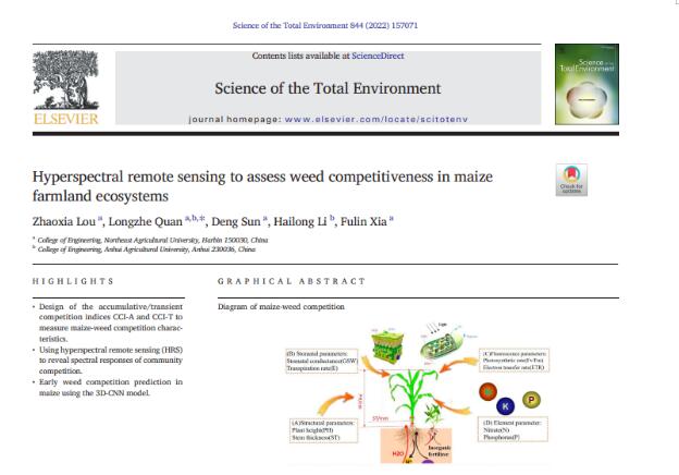 本网讯 近日,《总体环境科学》(IF=10.754,中科院一区)发表了我校工学院权龙哲教授智能农田管理装备团队的最新研究成果《高光谱遥感评估玉米农田生态系统杂草竞争力》(Hyperspectral remote sensing to assess weed competitiveness in maize farmland ecosystems)。该研究描述了一种玉米高通量表型的综合竞争指标和深度学习相结合的杂草竞争评估方法。结果表明,玉米植株的株高、茎粗和营养元素等累积参量随着竞争水平的增强不断下降,气孔导度(GSW)、蒸腾速率(E)等瞬态参量随着竞争水平的增强出现先升高后下降的波动变化;与传统竞争系数RCI相比CCI的标准差为0.303、0.499,CCI的离散程度更好,更适合量化竞争响应。然后应用高光谱遥感图像结合人工智能模型3DCNN揭示不同杂草竞争压力的光谱响应,并进行杂草竞争的早期预测。3DCNN模型对于不同的竞争水平使用13个特征波段达到了RMSE=0.106、0.152的预测精度,可以准确量化竞争系数的细微变化,该研究可为农田杂草智慧防控与智能除草装备研制提供理论支撑。