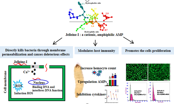 另外,为了探索抗菌肽在食品领域中的应用,作者以从蜜蜂蜂王浆中鉴定的抗菌肽Jelleine-I为对象,系统研究了其对人类食源性病原菌-李斯特菌的抗菌活性和作用机制。发现该肽还可调节宿主免疫,促进哺乳动物细胞增殖。在活体内它能有效地杀死细菌,并显著提高受感染昆虫的存活率。该成果近期以“In vitro and in vivo antimicrobial activity of antimicrobial peptide Jelleine-I against foodborne pathogen Listeria monocytogenes”为题发表在农林科学领域国际权威期刊《International Journal of Food Microbiology》上(中科院1区,Top)。