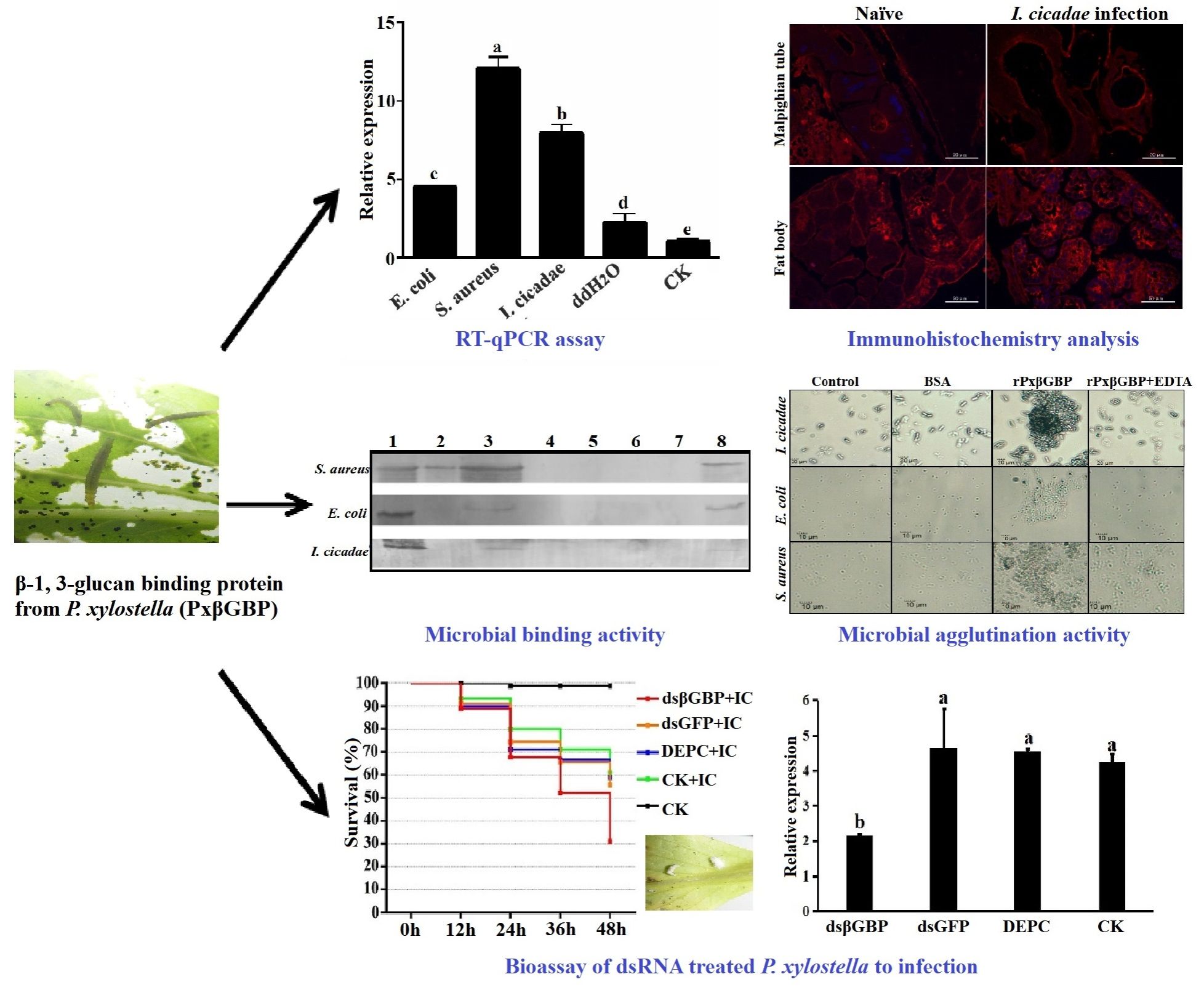 小菜蛾是全球臭名昭著的重要害虫,对杀虫剂产生了严重的抗药性。生物防治可用于抗药性害虫的治理。阐明害虫的免疫机制,有助于提高生物防治的防治效果,也可为生物农药提供可能的杀虫靶标。为此作者系统分析和研究了一种来自小菜蛾的β-1,3-葡聚糖结合蛋白的免疫功能,并评估了其对小菜蛾的生物防治潜力。该成果以“Silencing β-1,3-glucan binding protein enhances the susceptibility of Plutella xylostella to entomopathogenic fungus Isaria cicadae”为题发表在农林科学领域国际权威期刊《Pest Management Science》上(中科院1区,Top)。