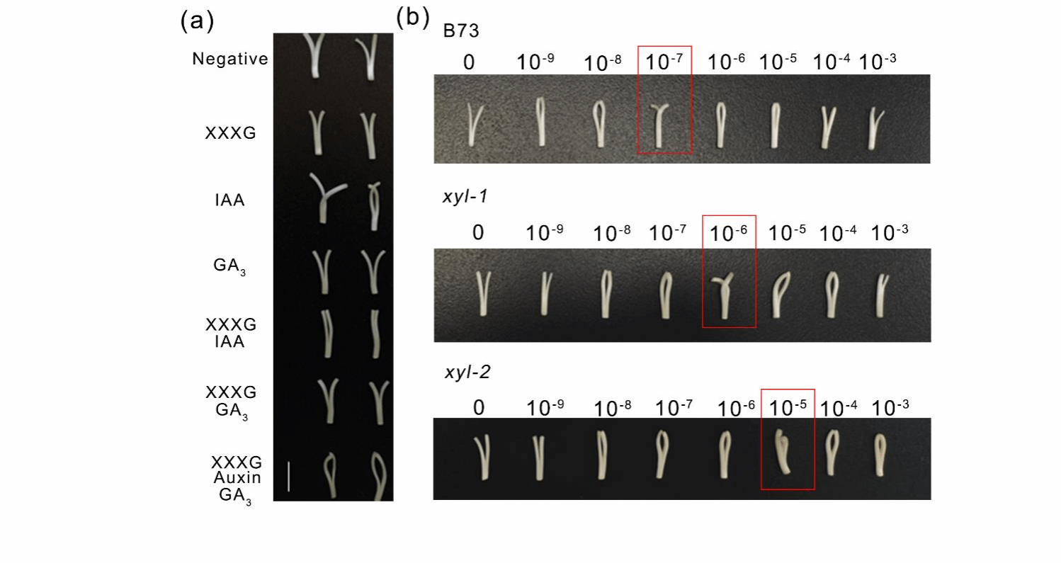 ZmXYL突变导致游离寡糖XXXG含量降低,结构性寡糖XXXG含量升高。通过中胚轴劈裂实验证明XXXG和生长素具有拮抗作用。该研究发现并确定了ZmXY的生物学功能,丰富了玉米细胞壁生物合成和重塑的分子调控网络,初步阐明了细胞壁和生长素的相互拮抗关系,为分子标记辅助育种提供参考。