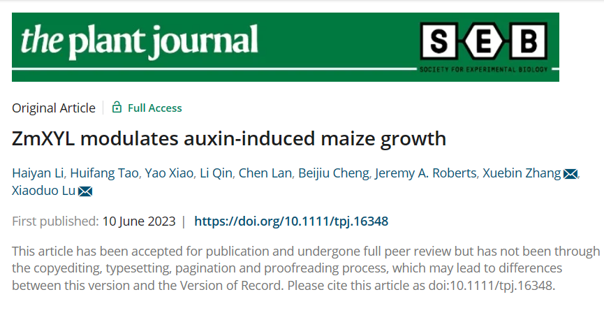 近日,我校生命科学学院路小铎教授课题组在《The Plant Journal》在线发表了题为“ZmXYL modulates auxin-induced maize growth”的研究论文,证明了ZmXYL编码的α-木糖苷酶参与水解细胞壁木葡聚糖,水解后产生的寡糖分子XXXG通过与生长素的拮抗作用抑制植物的生长发育。