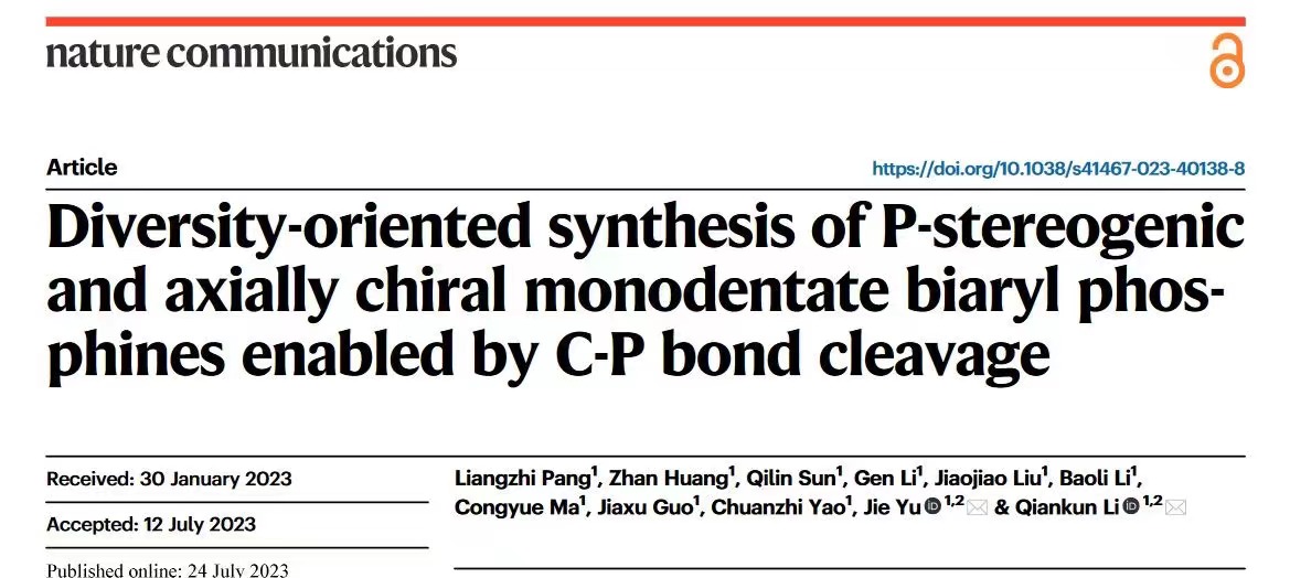 本网讯 近日,我校理学院手性功能分子合成团队在《自然·通讯》(Nature Communications,IF = 16.6)发表题为《Diversity-oriented Synthesis of P-stereogenic and Axially Chiral Monodentate Biaryl Phosphines Enabled by C-P Bond Cleavage》的研究论文。我校理学院2020级研究生庞良智为论文第一作者,李乾坤教授和俞杰教授为共同通讯作者。我校为论文唯一完成单位与通讯单位。该研究得到国家自然科学基金、安徽省自然科学基金、安徽省留学回国人员创新创业扶持计划及学校高层次人才引进科研启动经费的资助。