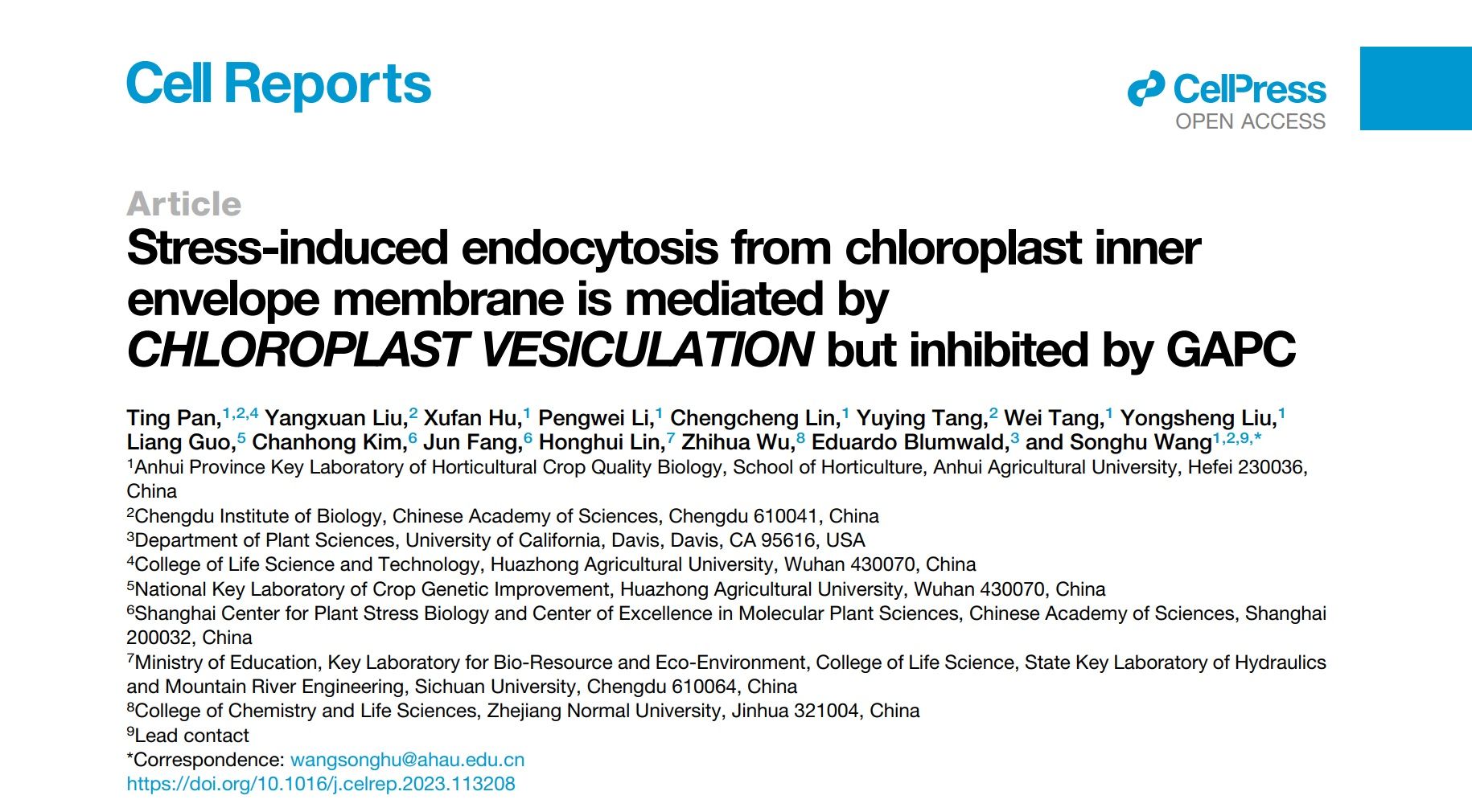 本网讯 近日,我校园艺学院汪松虎教授课题组在《Cell Reports》上发表了题为“Stress-induced endocytosis from chloroplast inner envelope membrane is mediated by CHLOROPLAST VESICULATION but inhibited by GAPC”的研究论文,解析了来自叶绿体内膜(chloroplast inner envelope membrane)的胞吞作用(endocytosis)参与胁迫条件下叶绿体降解的分子机制。