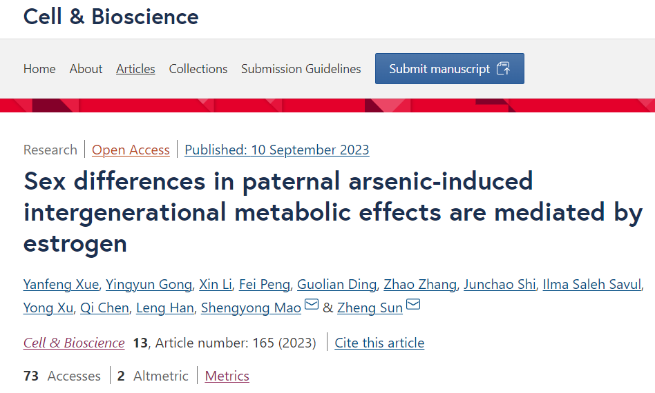 本网讯 近日,我校动物科技学院薛艳锋教授在生物学知名期刊《Cell and Bioscience》上发表了题为“Sex differences in paternal arsenic-induced intergenerational metabolic effects are mediated by estrogen”的文章。该工作是在前期发现父系无机砷(iAs)暴露引起子代糖脂代谢出现性别差异(Yingyun Gong and Yanfeng Xue et al., 2021, Advanced Science)的基础上,进一步延长父系iAs暴露的时间,充分显现子代糖脂代谢性别差异的表型,然后通过卵巢切除手术和肝脏雌激素受体ERα/β特异性敲除技术,揭示了肝脏雌激素信号通路在父系iAs暴露引起子代公鼠和母鼠糖脂代谢性别差异中的调控机制。