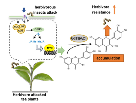 本网讯 类黄酮是茶树体内重要的次生代谢产物,其不仅是茶叶重要风味品质及健康属性形成的物质基础,而且在茶树的防御中发挥着关键作用。黄酮醇属于黄酮类化合物,是黄酮类化合物中数量最多,分布最广泛的一类,在茶树等植物的抗虫中发挥积极作用。黄酮醇在茶树中主要以糖苷形式储存,但截止目前其糖苷化机制及在茶树抗虫中的生理功能仍不清晰。