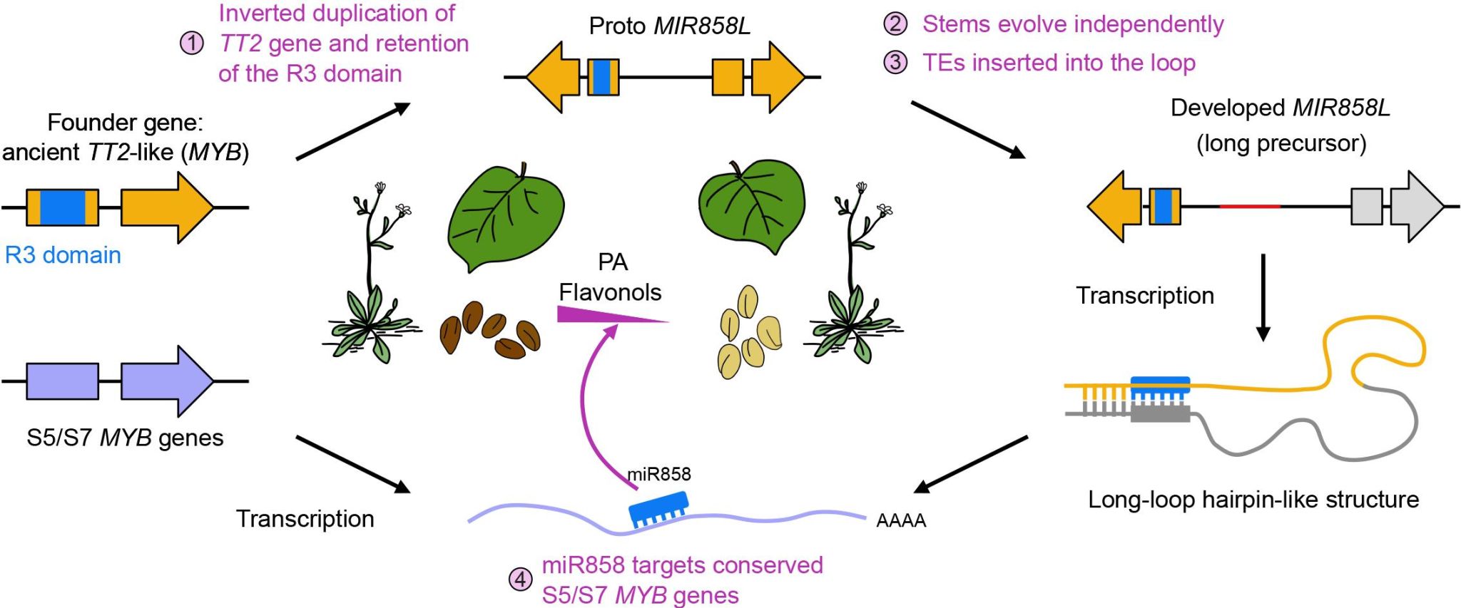 小RNA(miRNA)是一类非蛋白质编码转录本,参与植物生长发育的转录后调控。miR858靶向MYB转录因子,而 MYB可以影响一系列次级代谢过程。尽管miR858及其187-nt前体在拟南芥(Arabidopsis thaliana)中已被报道,但类似的miR858前体在多数植物中一直未能鉴别到。。