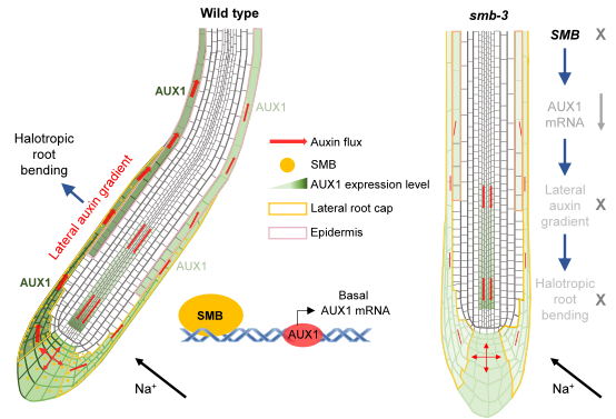 盐胁迫严重阻碍了植物的生长发育以及农作物的产量。面对日益恶化的土壤盐胁迫,植物能够主动调控生长发育以适应逆境环境。根系是植物最先受到土壤中盐胁迫影响的器官,植物可以通过改变根系生长方向以减少暴露在高盐环境中的行为称为避盐性 (Halotropism)。根系避盐性可以被经典的乔罗尼–文特模型(Cholodny-Went model)所解释,即植物激素生长素从根尖的近盐侧转移到远盐侧,导致生长素分布不对称和根系弯曲从而躲避盐胁迫。位于根尖分生组织干细胞周围的根冠是生长素转运发生的重要场所,同时也在感知养分和环境因子以及根系发育中发挥着重要的作用。然而,根冠是否介导根的避盐性以及相关的调控基因尚不清楚。