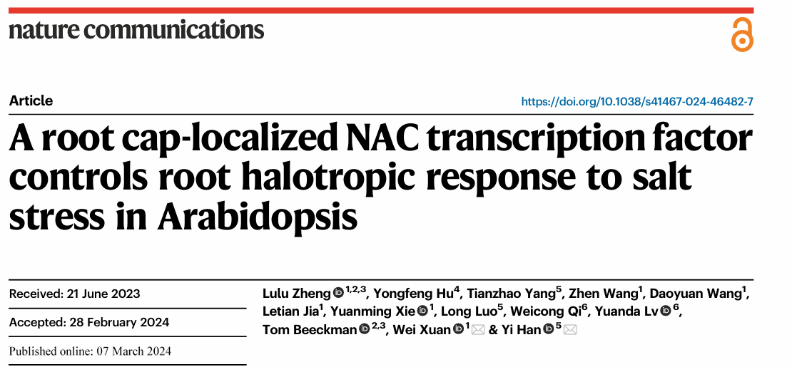 安徽农业大学生命科学学院韩毅教授为论文第一通讯作者,南京农业大学资源与环境科学学院宣伟教授为该论文共同通讯作者,南京农业大学资源与环境科学学院博士生郑路路为第一作者,三峡大学胡永峰副教授、江苏省农业科学院戚维聪副研究员、吕远大研究员、比利时根特大学VIB植物系统生物学研究中心Tom Beeckman教授参与了课题。该研究得到了国家重点研发计划、国家自然科学基金和三亚“崖州湾”菁英人才科技专项、安徽省自然科学基金、安徽农业大学人才启动基金和中央高校基本科研业务费的资助。(图文/韩毅 编辑/程玉磊 预审/薛挺 审核/夏晓昀)