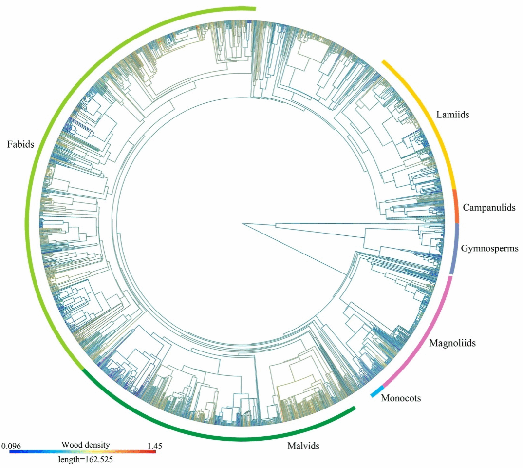 基于该研究结果,团队进一步研究了异速生物量模型中除树高和胸径之外的自变量——木材密度,收集并构建了包含2621个树种、7555个研究地点的27297个木材密度数据集,评估了不同分类(如被子植物和裸子植物)和生态(如热带、温带和寒带)树种群体的系统发育信号,探讨了木材密度的生物地理和系统发育模式,并量化了当前环境因素(如气候和土壤变量)和进化历史(即物种和谱系间的系统发育关联性)在驱动全球木材密度变异中的相对重要性。研究结果凸显了遗传进化在驱动植物功能性状变异中的重要性。相关工作于2024年以“Evolutionary history shapes variation of wood density of tree species across the world”为标题发表于Plant Diversity期刊。