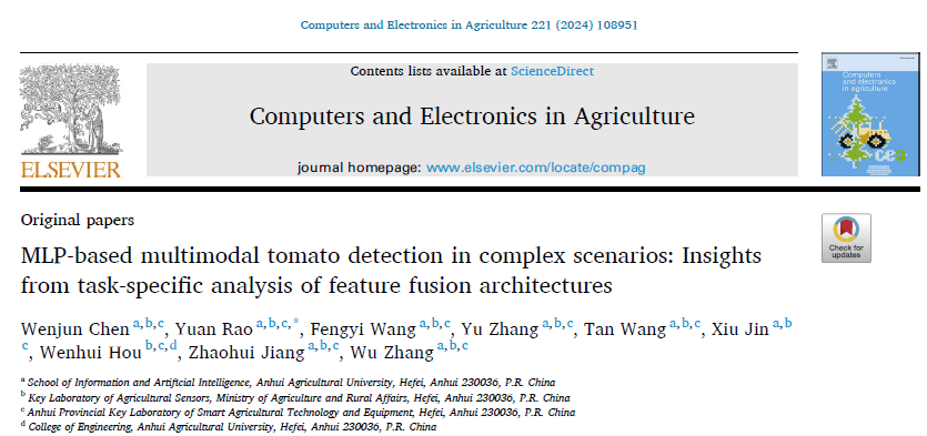 本网讯 近日,信息与人工智能学院智能科学与技术系饶元教授团队在《Computers and Electronics in Agriculture》期刊(中科院一区Top期刊,IF: 8.3)在线发表了题为《MLP-based multimodal tomato detection in complex scenarios: Insights from task-specific analysis of feature fusion architectures》的研究论文。研究提出了一个多模态融合编码器,使用可见光、深度、近红外三模态融合缓解复杂真实场景下果实检测性能不稳定问题。