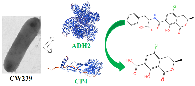 赭曲霉毒素A(OTA)主要由曲霉属和青霉属真菌产生,具有强烈的肾毒性和三致活性,广泛污染葡萄、可可、咖啡、燕麦和大麦等农产品。近年来,赭曲霉毒素生物解毒因其高效性、特异性和无二次污染等优势得到了快速发展。该研究筛选了一株对OTA具有高效降解活性凝结溶杆菌CW239,并解析了其对OTA的降解机制。菌株CW239中含有一个超高活性的酰胺水解酶ADH2和一个低活性的羧肽酶CP4;低活性羧肽酶基因cp4在菌株CW239体内,通过调节高效降解基因adh2的表达水平,有效增强了宿主菌株CW239对OTA的降解转化活性,两个基因对OTA的降解具有显著的协同效应。酰胺水解酶ADH2是迄今为止催化效率最高的OTA解毒酶之一,其催化效率与课题组之前发表的酰胺水解酶ADH3(Applied and Environmental Microbiology, 2022, e01964-21)相当,但酰胺水解酶ADH2的异源表达可溶性更高,具有更好的产业化应用潜力。