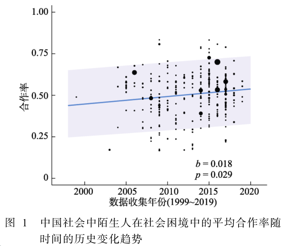 该研究分析了29249名中国人在囚徒困境和公共物品困境范式中与陌生人进行互动的合作行为实验数据,研究发现,在过去的20年间,中国社会中陌生人之间的合作行为随着年代的变化表现出升高的趋势(见图1)。
