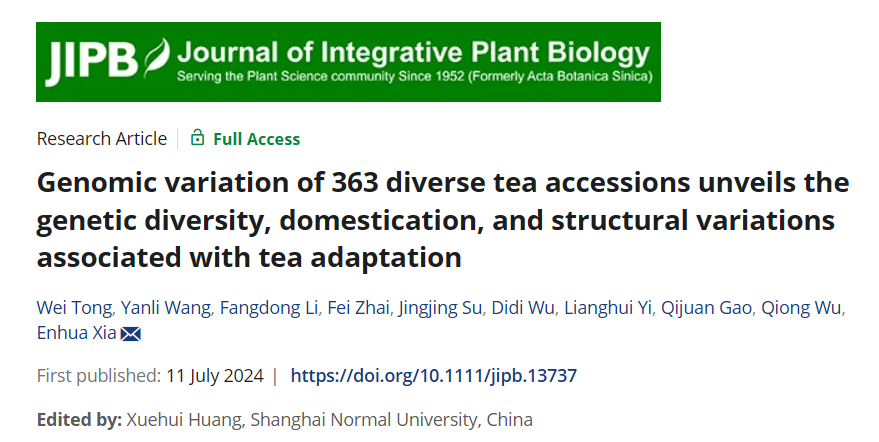 本网讯 近日,植物学权威期刊Journal of Integrative Plant Biology在线发表了安徽农业大学茶树生物学与资源利用国家重点实验室夏恩华教授团队题为“Genomic variation of 363 diverse tea accessions unveils the genetic diversity, domestication, and structural variations associated with tea adaptation”的研究论文。该研究基于363份茶树种质资源揭示了茶树群体结构和遗传多样性的演变规律,初步阐明了遗传变异驱动大叶茶和小叶茶适应性进化的机制。