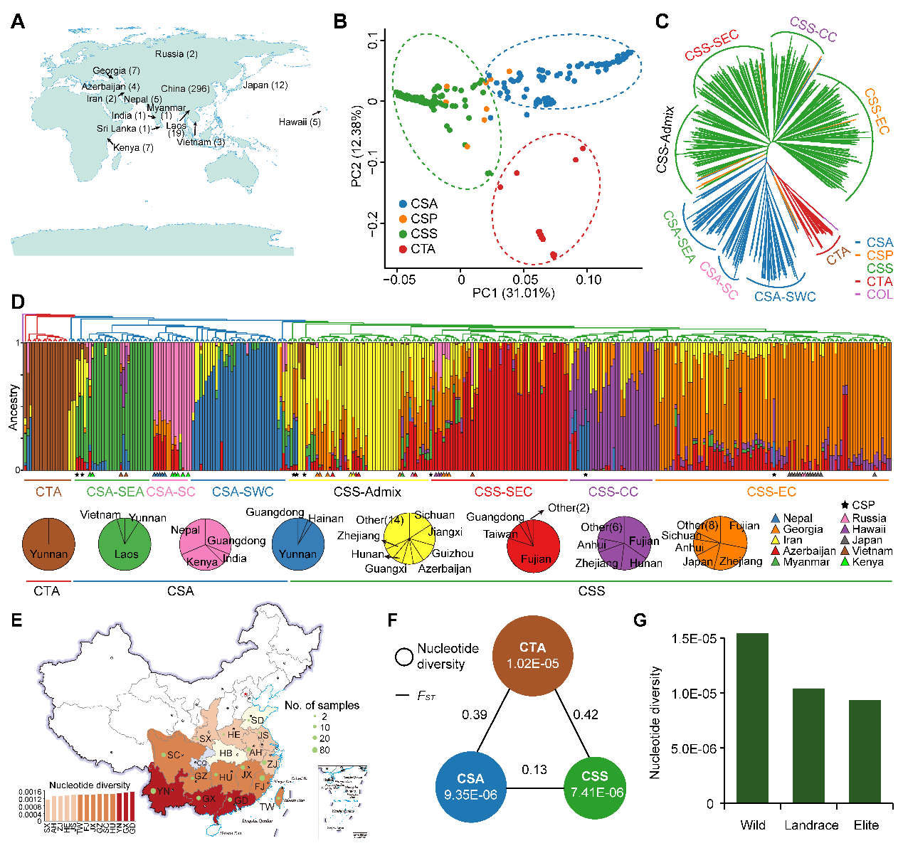 遗传多样性和驯化起源是茶树基础生物学研究长期关注的科学问题,然而受限于茶树种质资源收集类型单一、样品代表性不足、参考基因组缺乏等原因,茶树的遗传多样性、群体结构特性、品质与抗性形成的驯化机理仍不清楚。特别是栽培茶树两个最主要的变种,即Camellia sinensis var. sinensis(俗称“小叶茶”)和Camellia sinensis var. assamica(俗称“大叶茶”),在分布范围、茶叶适制性和抗寒性等方面存在明显差异,然而这些差异形成的遗传基础也不清楚。为此,本研究利用已公布的来自14个国家和地区的363份栽培和野生茶树的全基因组重测序数据对茶树的群体结构、遗传变异图谱和驯化机制进行了深入研究,发现栽培茶树种群结构可分为7个亚群,与其地理分布基本一致;我国的茶树遗传多样性由西南向华东逐渐降低;大叶茶比小叶茶具有更高的遗传多样性。选择性清除分析发现,大叶茶与小叶茶具有不同的驯化特征,其中大叶茶的驯化基因主要参与叶片发育、黄酮和生物碱的生物合成等过程,而小叶茶的驯化基因主要参与氨基酸代谢、芳香化合物的生物合成和低温胁迫等,可能造成二者具有明显差异的茶叶适制性和抗逆性。研究还从栽培茶树群体水平鉴定了6,058个新基因和217,376个结构变异,发现这些变异与茶树的品质和抗性形成密切相关。进一步功能实验初步证明大、小叶茶间CSS0049975 和CSS0006599基因的“存在/缺失”变异可能有助于二者抗寒性状的分化。研究结果丰富了对茶树遗传多样性和群体进化的认识,为茶树科学育种提供了数据支撑。