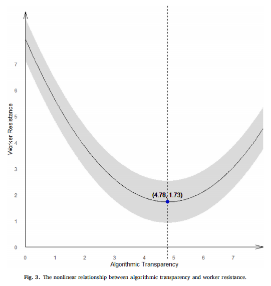 在算法管理中,透明度问题已成为平台和工人之间的一大痛点。工人们抱怨自己像是在与一个“黑箱”作斗争——算法如何决定他们的工作机会和收入,完全不得而知。然而,是否算法的透明性越高,工人对算法的抵抗行为越少?该研究发现,算法透明性在初期确实能够增强工人对算法的公平性感知,并减少抵抗行为。然而,随着透明度超过某个临界点,进一步增加透明反而会导致工人公平感的下降,并激化抵抗行为(如下图所示)。这一发现挑战了以往关于透明性总是有利的观点,为企业在算法管理中的透明性设计提供了新的思路。