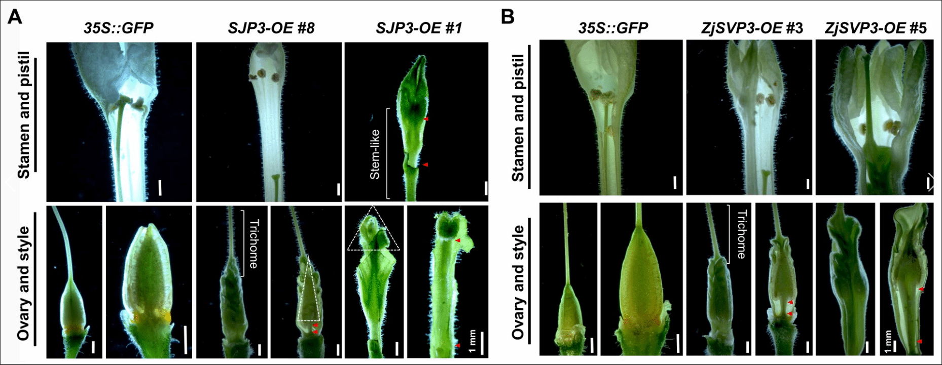 图2 效应因子SJP3与MADS-box转录因子ZjSVP3均引起雌蕊变态发育症状