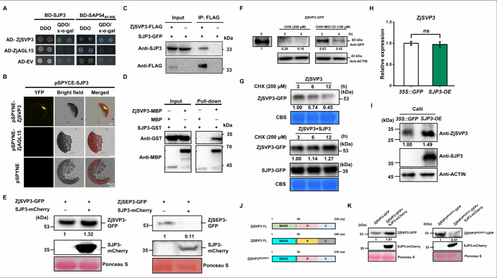 图1 效应因子SJP3与MADS-box转录因子ZjSVP3互作且稳定其蛋白表达