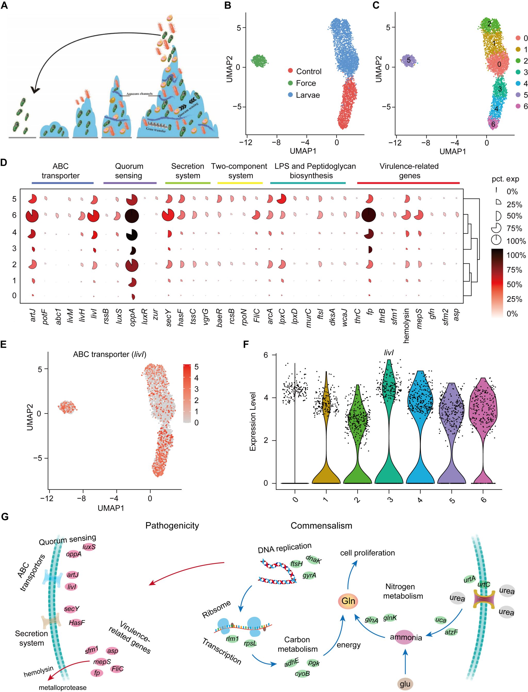自然界微生物种群通常聚集在几十微米空间范围内,会形成劳动分工与合作,从而分化为表型异质性亚群(图2A,源于网络),以应对环境的快速变化,也是病原菌产生抗性重要原因之一。传统的研究微生物方法仅仅停留在于群体平均水平,不能揭示微生物个体间异质性。单细胞转录组测序技术可以揭示出个体细胞间差异,并在真核细胞内被成功地利用,但是在细菌内遭遇了技术阻碍,进展缓慢,因为细菌裂解难度大、mRNA缺少polyA尾巴和mRNA丰度低等。与我们合作的浙江大学王永成团队研发出基于液滴高通量细菌单细胞RNA-seq方法成功地解决了上述问题。我们团队与王永成团队和湖南大学王奕蓉团队开展合作,率先利用了这项新技术,首次解析出果蝇调控病原粘质沙雷氏菌的转录异质性。基因表达谱聚类可视化分析显示,细菌细胞群体倾向于形成三个不同亚群(图2B),同时细胞表达谱分组算法将整个群体进一步划分为7个亚群(图2C)。我们鉴定与致病性相关差异基因,并对每个聚类中标记基因进行对应排序(图2D),并在二维空间中绘制出代表性基因livI在每个细菌细胞中特征表达(图2E-F)。利用类似方法,我们解析了共生态粘质沙雷氏菌增殖异质性,并且依赖于细胞内的碳氮代谢(图2G)。本研究成果获得了审稿人高度评价,认为本研究独辟蹊径解析了宿主与共生菌之间互作另一面,并且利用新技术解析了病原菌致病异质性及宿主对其重要影响,加深了宿主与共生菌互作机制的认知,同时为防控病原菌提供了一定借鉴。