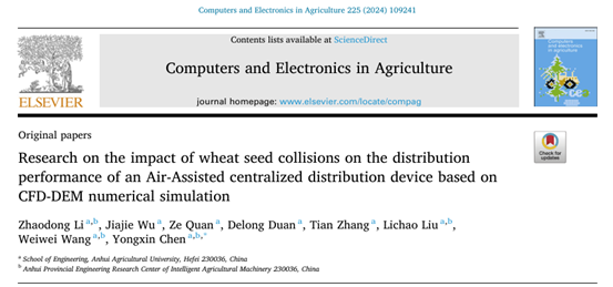 本网讯 近日我校工学院李兆东副教授课题组在期刊《Computers and Electronics in Agriculture》(中科院1区TOP,IF=7.7)发表题为“Research on the impact of wheat seed collisions on the distribution performance of an Air-Assisted centralized distribution device based on CFD-DEM numerical simulation”的研究论文。该研究基于CFD-DEM耦合仿真技术和区域划分方法揭示了小麦集排气送式排种器分种装置内种子碰撞频率对分种性能影响规律。