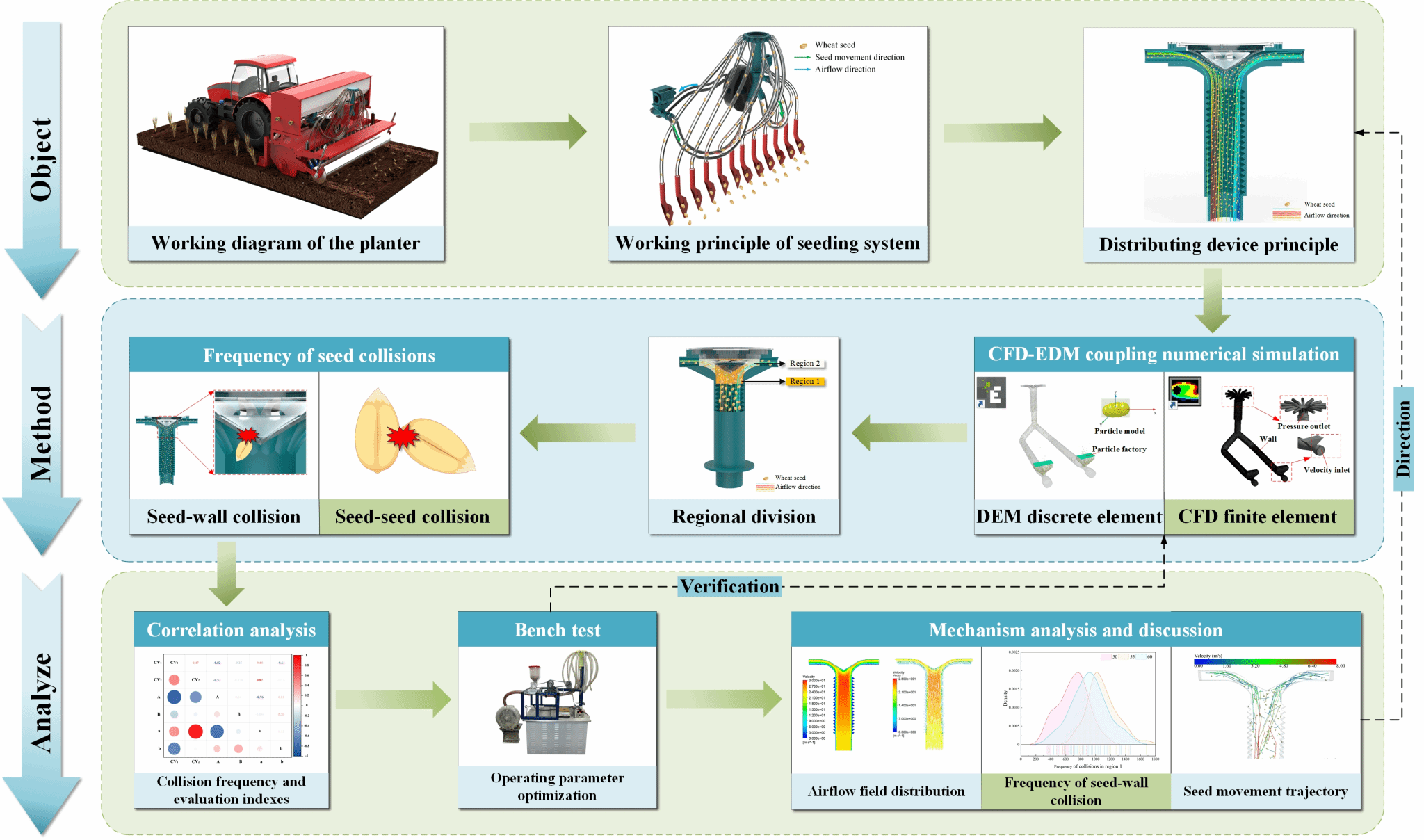小麦是我国重要的粮食作物,在我国粮食生产、粮食安全和居民消费中具有重要地位。播种技术是影响小麦产量的关键因素之一,2021年我国小麦机播水平已高达93.48%,领先于其它主要粮食作物(中国国家统计局2021)。然而,随着我国土地流转率的提高,耕地规模逐渐增大,种植户对高速播种机的需求日益增加。小麦播种机按排种原理主要分为机械式和气送式,其中气送式排种器采用“机械定量供种+气流分配成行”的工作原理,因其具有排种速度快、不伤种等优点得到应用广泛。为提升气送式播种机作业性能,国内外学者对气送式排种器进行了广泛的研究,但对于其核心部件—分种装置内种子碰撞对分种均匀性影响规律研究甚少,对于分种装置的优化设计方向不明。