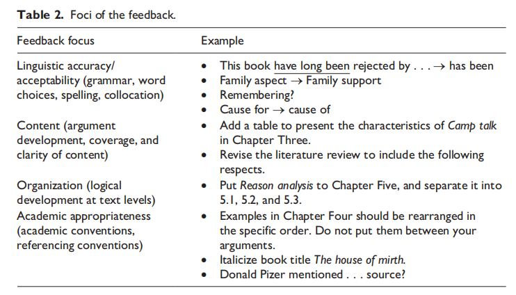 情感参与、行为参与和认知参与是三个重要的参与维度。参与本研究的学生对电子、书面反馈,以及论文指导会议中提供的口头反馈均持积极态度。参与者认为导师反馈能够提高论文的写作质量,增强他们的学术技能,并对导师反馈均表现出了较高的行为参与度,例如查阅资料、积极进行论文修订等。值得注意的是,他们表示在论文的结构和内容方面通常需要花费更多的精力。此外,在认知参与方面,学生之间存在显著差异,主要体现在运用元认知策略来处理、理解和应用导师反馈的方式上。
