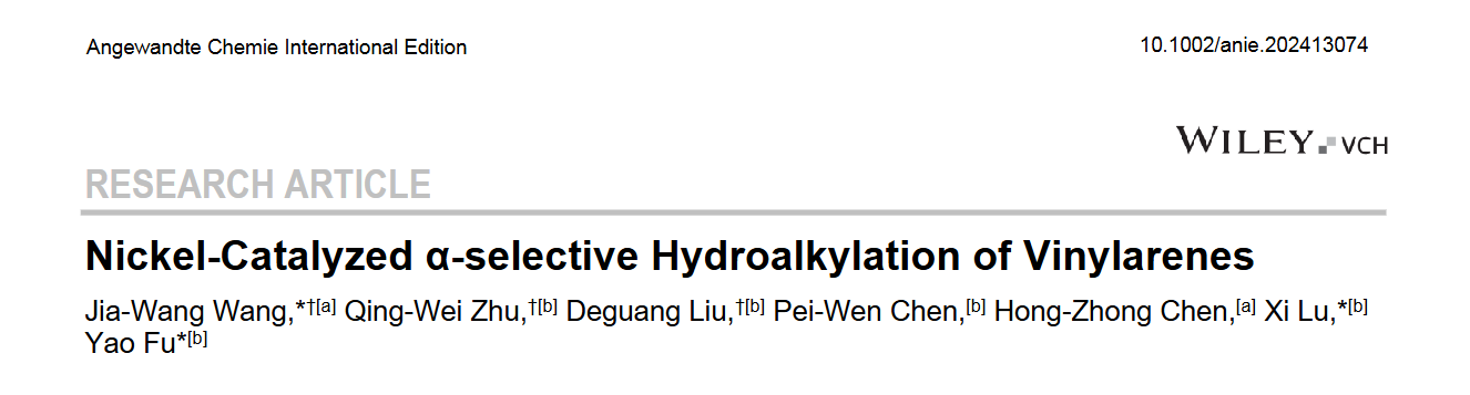 本网讯 近日,我校王加旺教授在国际著名期刊《Angewandte Chemie International Edition》(中科院一区,IF=16.1)上发表题为《Nickel‐Catalyzed α‐selective Hydroalkylation of Vinylarenes》的研究性论文。