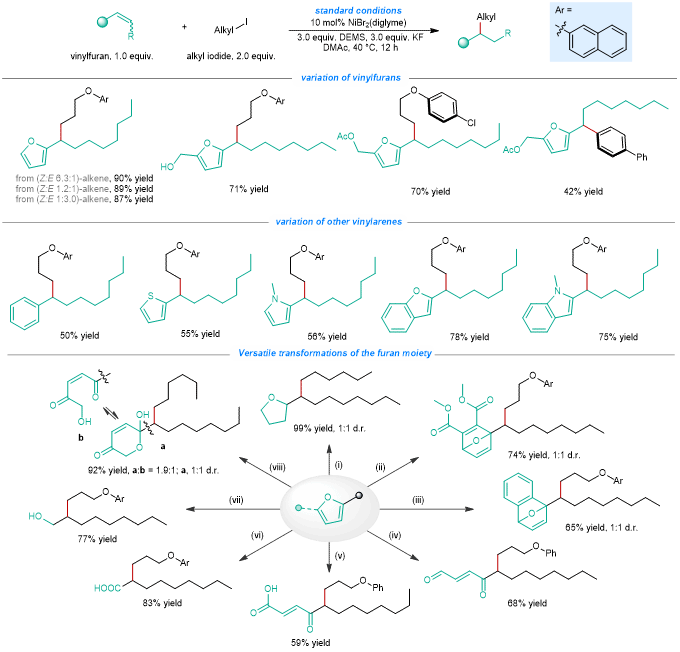 呋喃基化学品的生产来源不同于简单芳烃化合物的石化来源,其主要来源于可再生生物质资源,如植物、农作物残余物等,通过开发和使用呋喃基化学品,可以减少对石油、煤炭和天然气等化石燃料的依赖,具有更好的可持续性。糠醛和5-羟甲基糠醛是非常具有代表性的呋喃基化合物。在本项研究中,作者利用呋喃基生物质平台化合物通过Wittig反应可以便捷合成烯基呋喃原料的优势,开展氢烷基化反应研究。结果表明,反应具有广泛的适用范围和出色的官能团兼容性,各种大位阻底物都能以较高的产率得到目标产物。呋喃基团的成功转化证实了此方法能够为使用生物质基化学品合成高价值功能化合物提供可靠途径。此外,反应条件还能直接用于各类(杂)芳基烯烃的氢烷基化转化,电中性或富电子的(杂)芳基烯烃在标准条件下都能得到氢烷基化产物。
