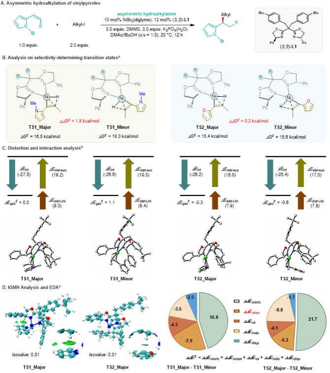 吡咯结构存在于药物分子和天然产物中,在生物活性、药物设计和分子相互作用方面表现出独特优势。通过在标准条件下引入手性双噁唑啉配体(S,S)-L1作为手性控制要素,作者实现了烯基吡咯的不对称氢烷基化转化。为了阐明烯基N-甲基吡咯和烯基呋喃在不对称控制中的差异,作者对镍氢迁移插入进行了密度泛函理论(DFT)计算,计算结果与实验结果一致。