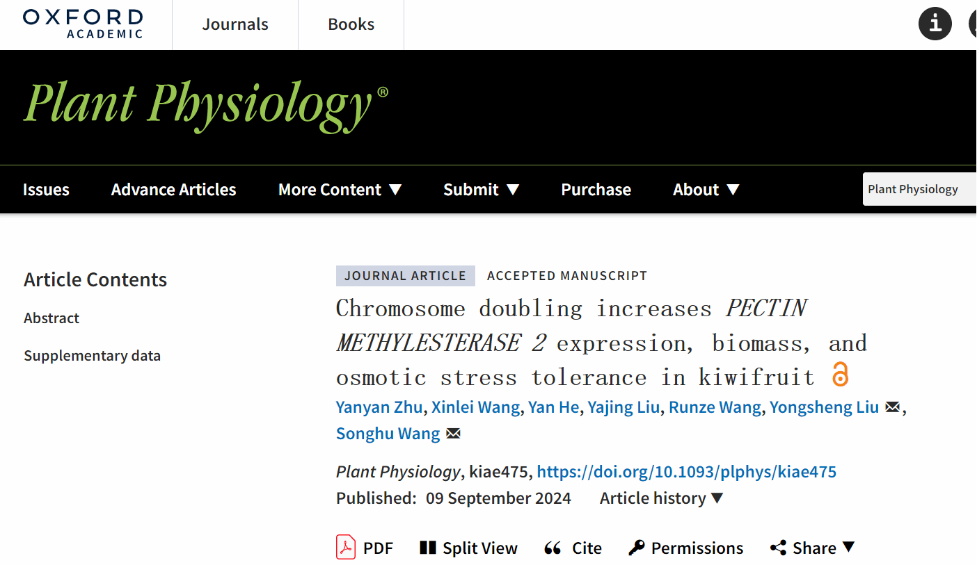 本网讯 多倍体育种是作物育种过程中常用的方法之一,染色体加倍后通常表现出生物量增加(产量提高)且抗逆性增强的表型,但其背后的分子机制目前还不太清楚。近日,安徽农业大学园艺学院汪松虎教授和刘永胜教授团队合作在国际著名的植物学期刊Plant Physiology上发表了题为“Chromosome doubling increases PECTIN METHYLESTERASE 2 expression, biomass, and osmotic stress tolerance in kiwifruit “的研究论文,揭示了猕猴桃染色体加倍导致生物量增加且抗逆性增强的分子机制。