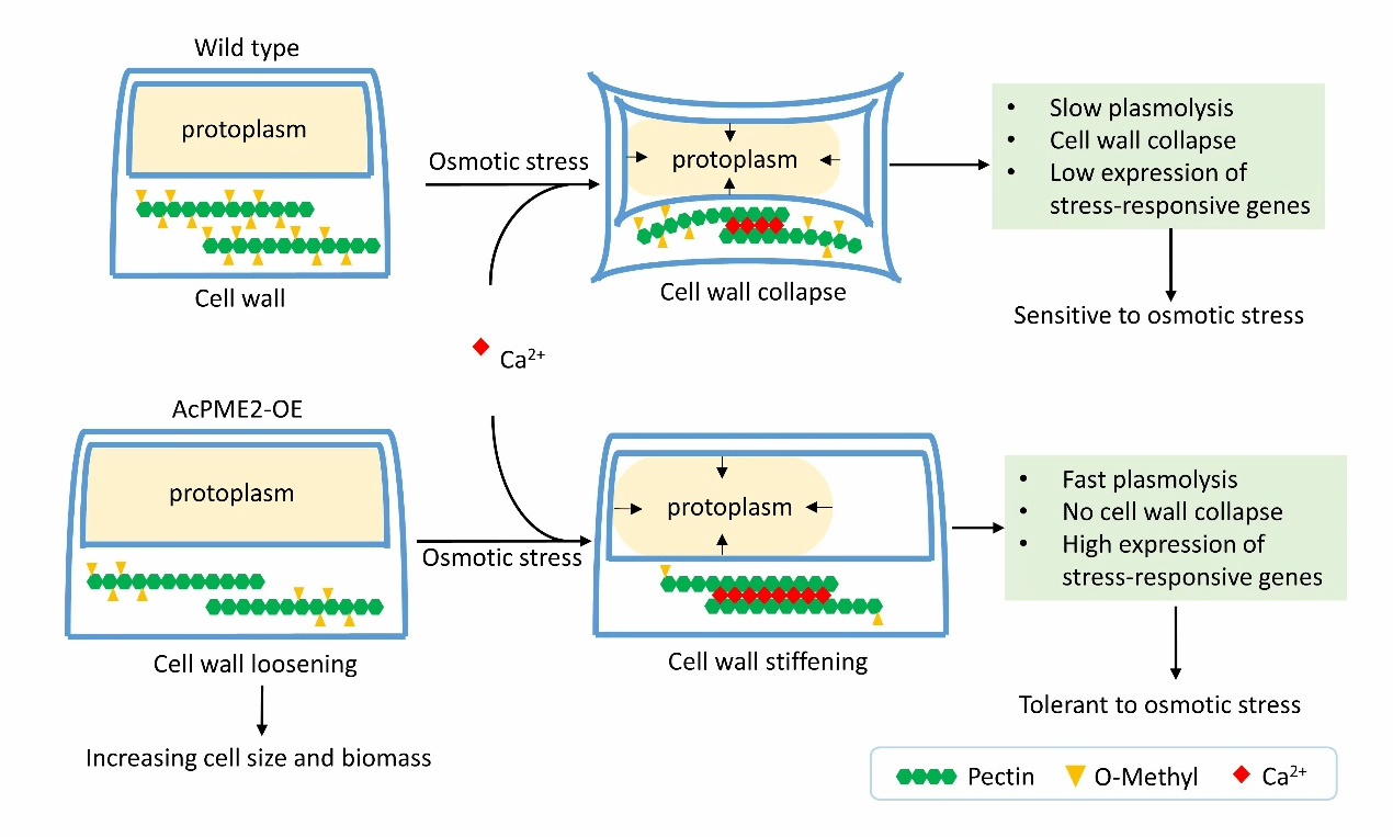 本研究发现AcPME2介导的果胶去甲酯化可以动态调控细胞壁的硬度,即在正常生长条件下降低细胞壁的硬度,促进细胞扩张从而导致生物量增加;但在渗透胁迫条件下,与Ca2+结合增加细胞壁的硬度,提高植株对胁迫的抗性(图2)。这种动态调控细胞壁硬度的机制可以为同时提高作物产量和抗逆性的遗传改良提供新的思路,AcPME2基因在作物育种过程中具有巨大的应用潜力。