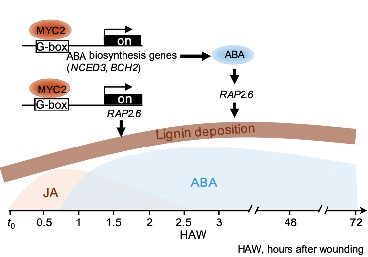 这种影响在JA信号被阻断的背景下变得更加明显,表明ABA在JA信号减弱时,起到了维持RAP2.6表达和促进木质素沉积的补偿作用。最后研究人员通过RNA-seq和ChIP-seq分析揭示,转录因子MYC2/3直接作用于ABA生物合成基因NCED3和BCH2上游的G-box基序并促进它们的表达。当ABA生物合成的关键基因NCED3发生突变后,RAP2.6对伤口的响应和伤口部位的木质素沉积在对JA的响应上也出现明显的减弱。这表明,JA信号通过激活MYC2/3来促进ABA的生物合成,进而在伤口部位维持木质素的积累。这一发现阐明了JA信号在植物伤口愈合过程中通过调节ABA合成来促进木质素沉积的机制。这一发现阐明了JA信号在植物伤口愈合过程中通过激活ABA信号途径维持木质素的持续性沉积(图3)。