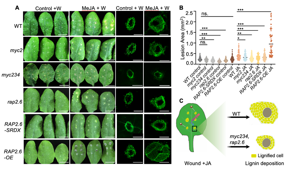 该研究通过在植物叶片中建立不同的损伤模式,发现损伤的方式直接导致不同的生长素分布模式。缺乏生长素高浓度积累的损伤形式,使得伤口处仅发生愈合而不是再生。该研究进一步发现,植物细胞在损伤后1小时内就快速累积木质素,且积累量随时间逐渐增加(图1)。茉莉酸(JA)作为植物响应伤口的快速信号,在植物损伤信号传导中扮演着重要角色。在缺少JA受体的突变体中,损伤细胞周围的木质素沉积显著减少。本研究通过基因共表达网络分析鉴定到一个持续响应伤口的转录因子RAP2.6,该因子与木质素合成基因共表达。在rap2.6突变体中,木质素合成基因的伤口响应被显著抑制,伤口处木质素沉积显著减少,并且对JA信号响应减弱(图2)。进一步研究发现,JA信号传导中心的转录因子MYC2能够直接结合RAP2.6启动子区域的G-box(CACATG)基序,并激活RAP2.6转录。这些结果表明RAP2.6在JA介导的伤口木质素沉积中起着关键作用。