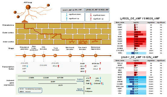通过比较转录组分析和酵母单杂交等实验,研究团队揭示了LjRSDL通过调节激素信号转导途径来控制丛枝菌根真菌丛枝的退化(图2)。这项研究不仅为深入理解植物与菌根真菌之间互利共生关系的形成机制提供了新的视角,而且为菌根共生动态调控和植物共生抗逆育种提供了新的理论依据。