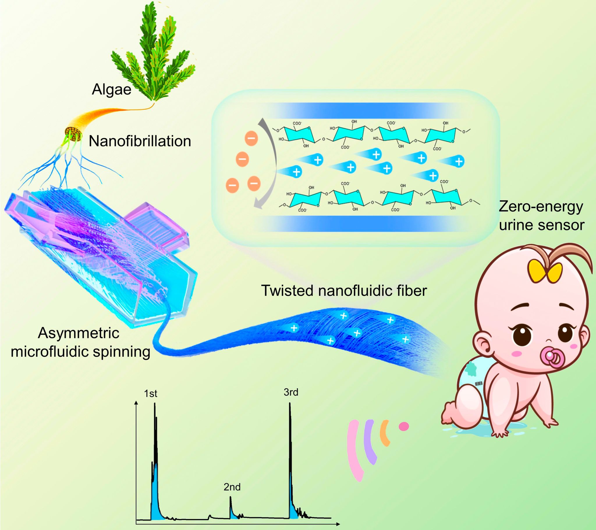 为应对上述挑战,叶冬冬教授团队通过不对称流场调节藻类纤维素纳米纤维的组装,制备了表面扭曲、内部对齐的藻类纤维(扭曲纤维)。相比于对称工艺制备的纤维,扭曲纤维表现出直径显著减小(从33.6 µm到20.4 µm)、堆积密度增加(从0.87 g/cm³到1.47 g/cm³)、断裂应力提高(从249.4 MPa到468.5 MPa),以及取向度提升(Herman取向因子从0.77到0.89)。在50倍盐度梯度下,扭曲纤维的能量收集能力达到12.87 W/m²,并可作为自供电尿液监测器,能够区分婴儿的排尿和运动行为。其在稀电解质下的高离子电导率(7.8 mS/cm)能有效提示尿液饱和。该研究为自供电生物质基纳米流体健康传感系统提供了新设计概念。