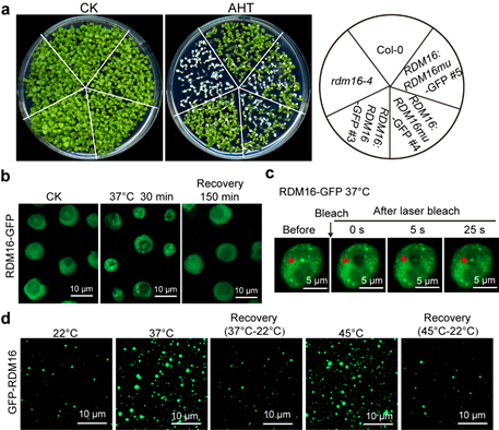 a, 与Col-0野生型相比,rdm16突变体具有热敏感表型;b-d, 高温处理能在体内(b, c)体外(d)促进RDM16的液相分离。