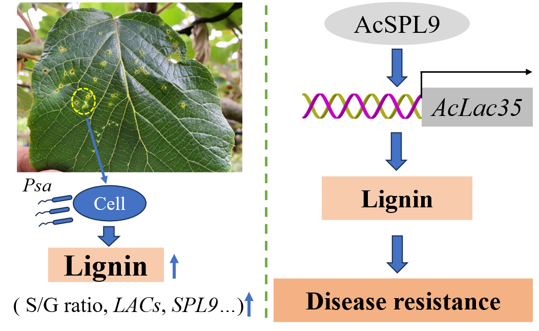 与此同时,研究人员通过酵母文库筛选鉴定到一个SBP基因家族成员AcSPL9可能结合AcLac35的启动子调控木质素的合成提高猕猴桃对Psa的抗性。借助酵母单杂交实验、瞬时烟草LUC实验和凝胶迁移实验等生理生化试验证实了AcSPL9可以结合AcLac35的启动子并正向激活。此外,稳定遗传转化和瞬时干涉等实验证实了AcSPL9可以促进AcLac35的表达提高猕猴桃对Psa的耐病性。该研究提出了AcSPL9-AcLac35的假设调控模型,通过提高木质素的含量增强猕猴桃对Psa的耐病性机制,为育种和抗病机制提出了新的例证。