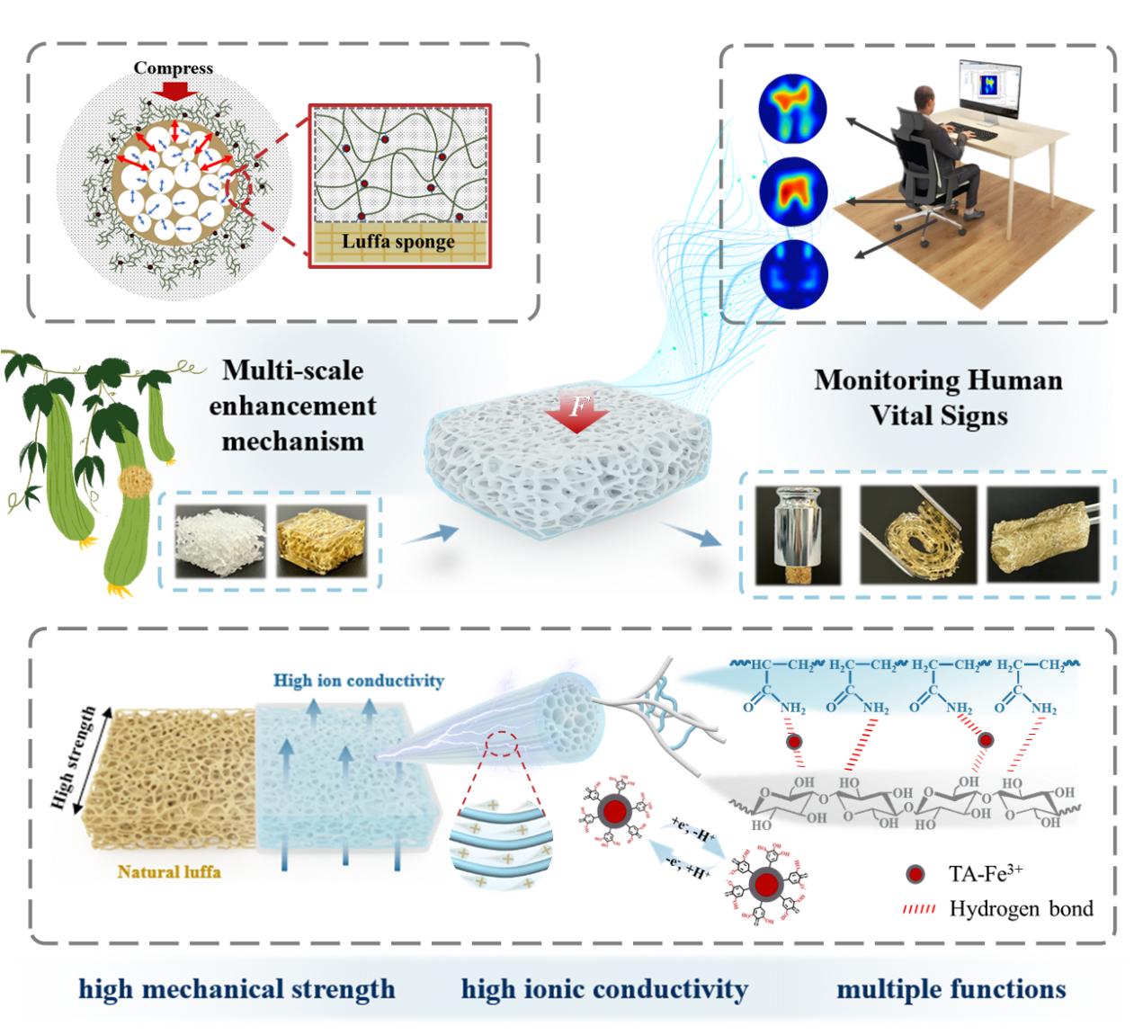 本网讯 近日,我校材料与化学学院安徽省健康睡眠家居产品工程中心陈玉霞教授团队在《Advanced Functional Materials》(中科院一区TOP, IF=18.5, 自然指数期刊) 发表生物质基水凝胶柔性传感器相关最新研究论文,题目为“Multifunctional Luffa Sponge Hydrogel with High Mechanical Strength, Fatigue Resistance, and Ionic Conductivity for Monitoring Human Vital Signs”。