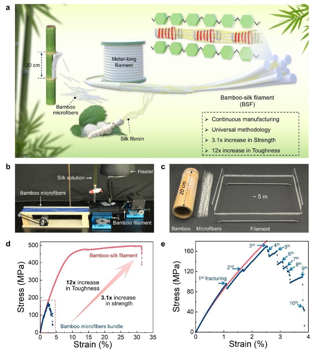 《生界面工程助力刚性纤维普适性增韧》(Biomimetic Interface Engineering Approach for Universal Toughening of Rigid Fibers)采用仿生界面工程的策略,成功将“强且脆”的竹纤维转化为兼具高强度(500 MPa)与高韧性(115±17 MJ m⁻³)的连续长纤维,其性能媲美天然蜘蛛丝。同时,研究通过“拉伸-剪切”模型表明BSF的卓越韧性主要归因于丝素蛋白的粘弹性以及蛋白质-纤维素界面的滑移,阐述了仿生界面工程的增韧机制。理论上任何刚度远高于丝素蛋白的材料都可以通过这种方法得到韧性增强。该策略为生物质纤维、合成纤维及无机纤维的高性能化提供了一项通用解决方案,未来有望开发出新一代轻质、高强、高韧的复合纤维,应用于柔性电子、智能纺织、结构复合材料等领域。