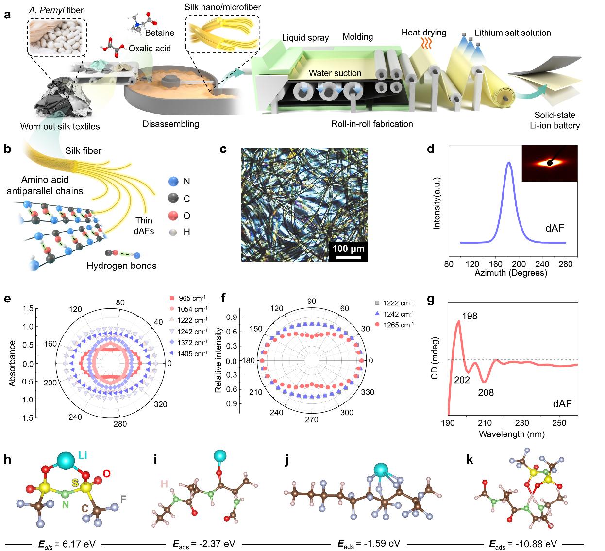 《基于柞蚕丝微/纳米纤维制备的规模化超薄固体电解质用于调节固态锂电池离子传输》(Scalable ultrathin solid electrolyte from recycled Antheraea pernyi silk with regulated ion transport for solid-state Li–S batteries)采用低共熔溶剂法,高效地从废旧柞蚕丝纤维中提取出保留原始介观结构的丝微/纳米纤维,利用这些具有高度取向的丝微/纳米纤维构筑了支撑超薄固体电解质的骨架材料。这种坚固骨架的加入不仅为Li+的传导建立了三维连续的途径,也阻碍了阴离子的迁移,有效地促进了均匀的Li+通量和局部电流密度分布,实现了均匀的Li+沉积。所制备的固态电池和高压袋状电池具有优异的放电容量和循环稳定性。