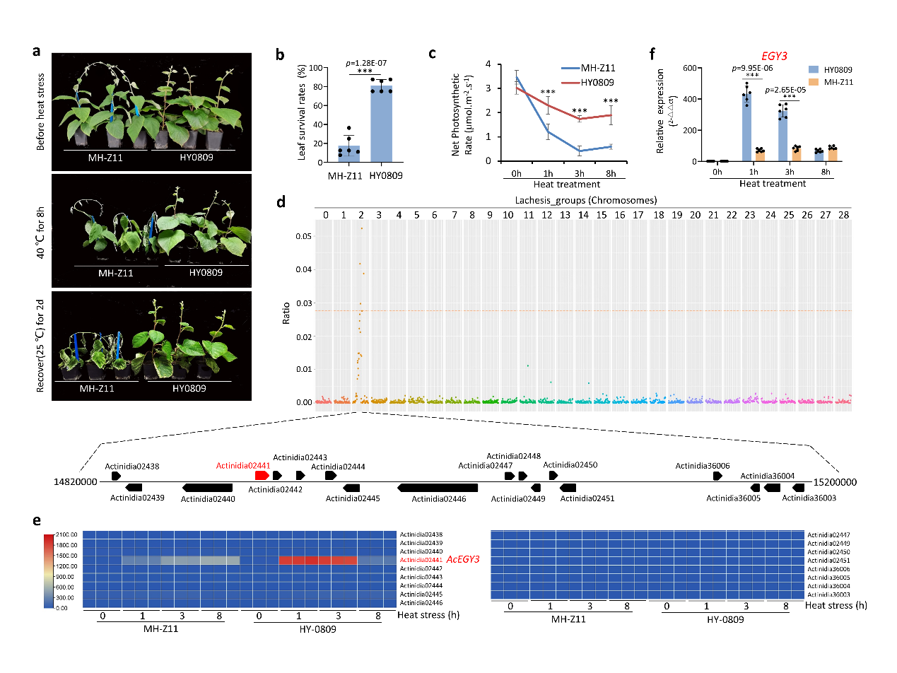 猕猴桃因富含维生素C等多种营养物质而风靡全球,被誉为“水果之王”。猕猴桃是一种喜温湿,害怕高温干旱的果树。持续高温可以导致猕猴桃果树叶片萎蔫,甚至植株干枯致死,进而影响猕猴桃果实的产量和品质。目前,可以直接应用于提高猕猴桃耐热性杂交育种的基因资源非常匮乏,耐热性相关的自然变异挖掘还未见报道。本研究通过将耐热性存在显著差异的两份材料“MH-Z11”(野生毛花猕猴桃、对热胁迫敏感)和“HY0809”(中华猕猴桃、相对耐热)进行杂交,构建遗传群体。对回交1代(BC1)群体单株进行高温胁迫下光合效率的测定,再利用BSA-seq介导的图位克隆的方法,鉴定到了一个调控猕猴桃耐热性的基因AcEGY3。该基因在两份猕猴桃材料中的表达存在极显著的差异,我们通过转基因(过表达和RNA干涉)的方法证实该基因的差异表达是影响两份材料耐热性差异的主要因素。