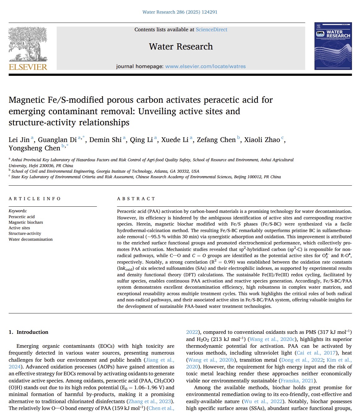 本网讯 近日,我校资源与环境学院环境功能材料团队青年教师狄广兰联合佐治亚理工学院陈勇生教授在环境科学与水资源领域顶级期刊《Water Research》(中科院一区,IF=12.4)上发表了题为“Magnetic Fe/S-modified porous carbon activates peracetic acid for emerging contaminant removal: unveiling active sites and structure-activity relationships”的研究论文,该研究深入解析了材料表面官能团介导过氧乙酸(PAA)活化生成活性物种与污染物降解的机制,推动了过氧乙酸基高级氧化工艺(PAA-AOPs)在水处理领域的发展。