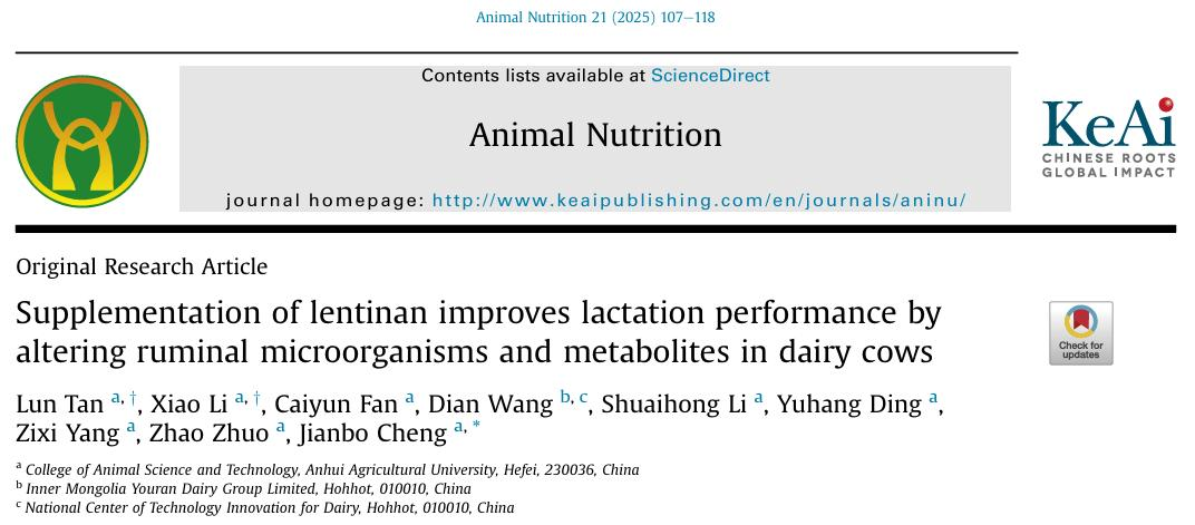 本网讯 我校动物科技学院反刍动物营养与饲料团队在畜牧学领域的中科院一区Top期刊《Animal Nutrition》上发表了题为“Supplementation of lentinan improves lactation performance by altering ruminal microorganisms and metabolites in dairy cows”的文章。该研究揭示了香菇多糖通过改变奶牛瘤胃微生物和代谢产物来提高泌乳性能的作用机制,为香菇多糖作为功能性添加剂在奶牛生产中的应用提供了重要的理论基础。