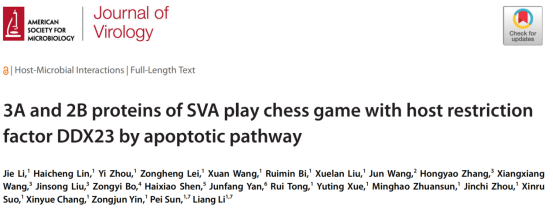本网讯 近日,我校动物医学院兽医传染病学课题组孙裴教授团队携手动物科技学院殷宗俊教授团队在国际权威学术期刊《Journal of Virology》发表了题为“3A and 2B proteins of SVA play chess game with host restriction factor DDX23 by apoptotic pathway”的研究论文。揭示了A型塞内卡病毒的3A和2B非结构蛋白如何通过凋亡途径与宿主DEAD-box RNA解旋酶23(DEAD-box helicase 23, DDX23)展开相互调控。该研究首次阐明了DDX23抑制SVA复制的机制,以及病毒的反制策略。这为理解病毒-宿主互动提供了新视角,并为针对性抗病毒策略和疫苗开发奠定基础。