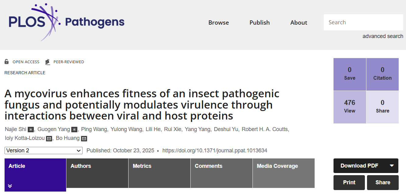 本网讯 近日,学校林学与园林学院黄勃教授团队在国际知名学术期刊《Plos Pathogens》(中科院1区,TOP期刊)发表了题为“A mycovirus enhances fitness of an insect pathogenic fungus and potentially modulates virulence through interactions between viral and host proteins”的研究论文。该研究从球孢白僵菌(Beauveria bassiana)菌株中分离到一株真菌病毒球孢白僵菌多聚病毒4-2(BbPmV4-2),该病毒能显著提升其宿主真菌球孢白僵菌(Beauveria bassiana)的产孢能力、环境耐受性及杀虫毒力。