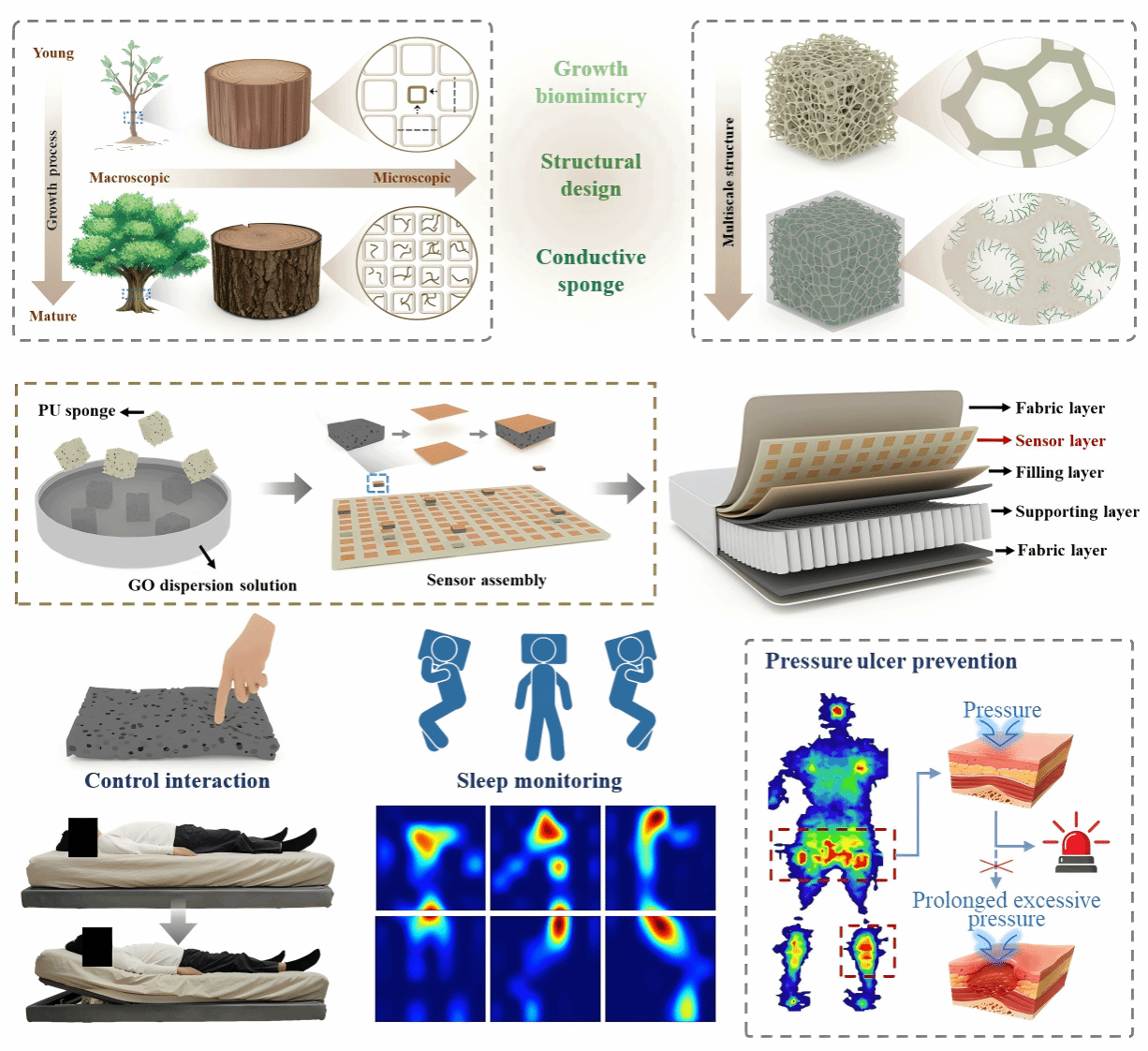 本网讯 近日,学校材料与化学学院安徽省健康睡眠家居产品工程中心(课题组网站:https://ergolab.ahau.edu.cn/)陈玉霞教授团队在《Advanced Science》(中科院一区TOP期刊,IF=15.6)发表了题为 “Biomimetic Multiscale-Structured Biomass Graphene/Polyurethane Sponge Composite for Flexible Pressure Sensors and Intelligent Cushioning Materials”的最新研究成果,报道了在生物质基海绵柔性压力传感器方面的重要进展。